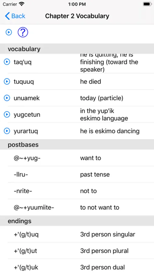 This is a 3rd party companion app to the book, A Practical Grammar of the Central Alaskan Yup'ik Eskimo Language, which is produced by the Alaska Native Language Center with the help of Steven and Anna Jacobson.