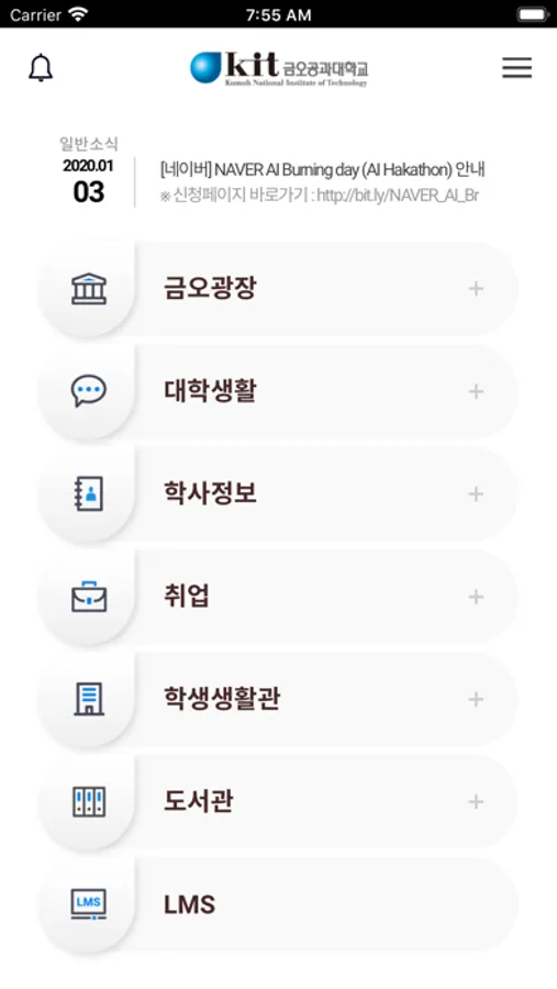 금오광장, 대학생활, 학사정보, 취업, 학생생활관, 도서관 , LMS, 모바일 신분증 등 다양한 서비스를 제공하고 있습니다.