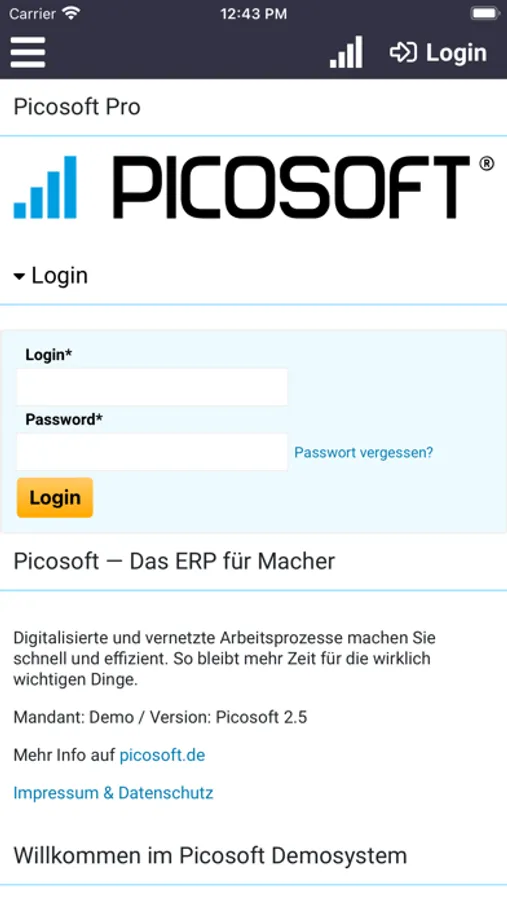 Mit unserer Picosoft-App erhalten Sie ein elegantes Werkzeug für den mobilen Zugriff auf Ihre Unternehmensdaten. Zudem erhalten Sie mit der App exklusive Funktionalitäten wie Push-Benachrichtigungen, dem Barcodescanner oder der GPS-Positionserfassung.