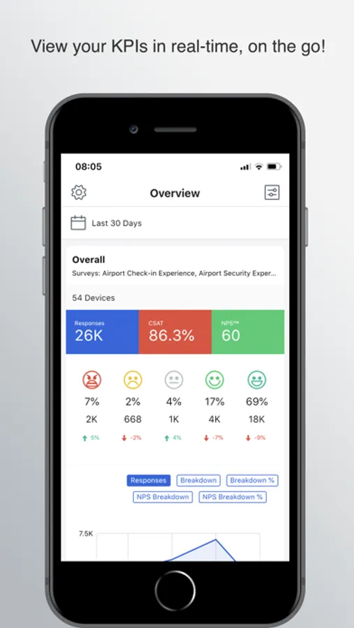 View KPIs generated by your surveys such as NPS (Net Promoter Score), CSAT Score (Customer Satisfaction Score), eNPS (Employee Net Promoter Score) etc in real-time.