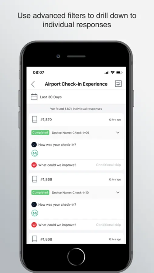View survey responses for all your surveys as they come in. Advanced filters allow you to review subsets of your data so you can hone in on problem areas.