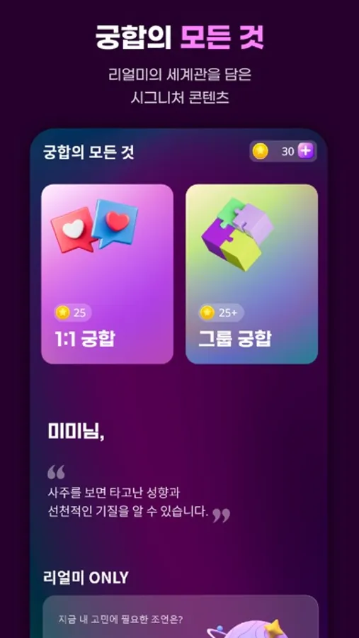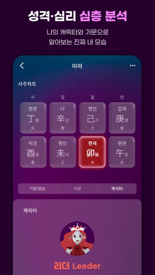 - 리얼미의 사주 시스템을 바탕으로 유형별 타고난 성향과 개인 특성을 심층 분석! 가문과 캐릭터로 표현되어 이해하기 쉬워요.