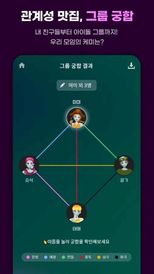 - 그룹 궁합 점수부터 조합별 관계성까지, 우리 중 누가 가장 사이가 좋을지 비교해보는 재미! 누구를 그룹화하냐에 따라 무궁무진해요.