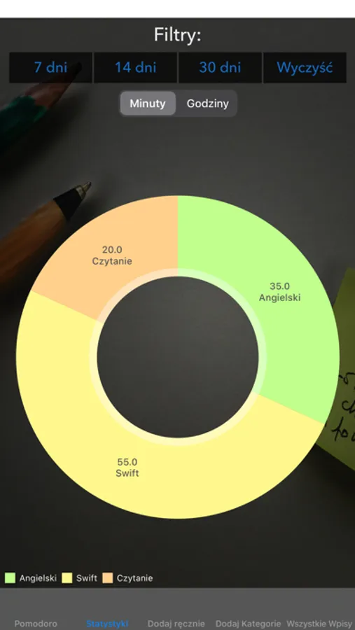 - Śledź statystyki czasu spędzonego nad zdefiniowanymi obszarami, dzięki czemu będziesz wiedział(a) co zajmuje Ci najwięcej czasu.