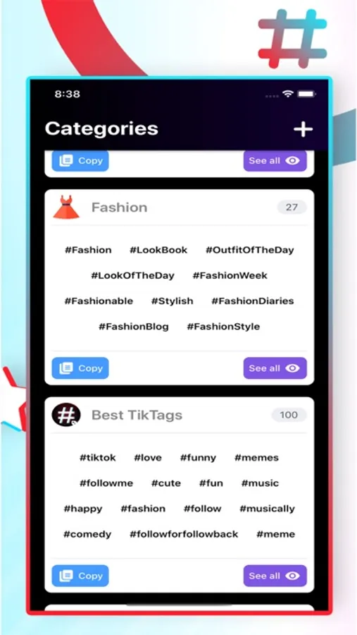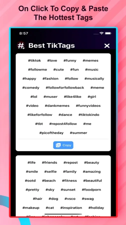 Welcome To TikTags Pro App Here we Help You To create your own tag collection to use for any tikTags video, start by adding keywords related to the subject of your New video , before making a final choice about the use of any tag you can see its realtime use data.