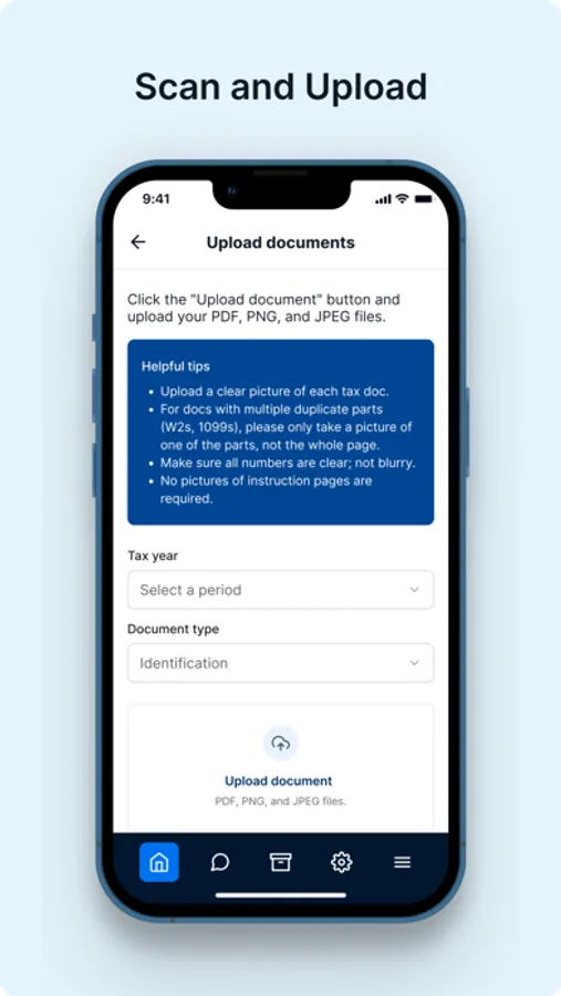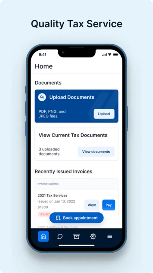 - Secure Document Transfer: Upload or snap photos of your tax documents and they will be securely sent to your tax pro.