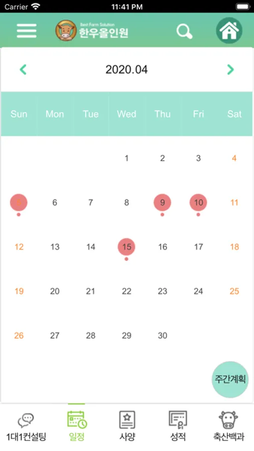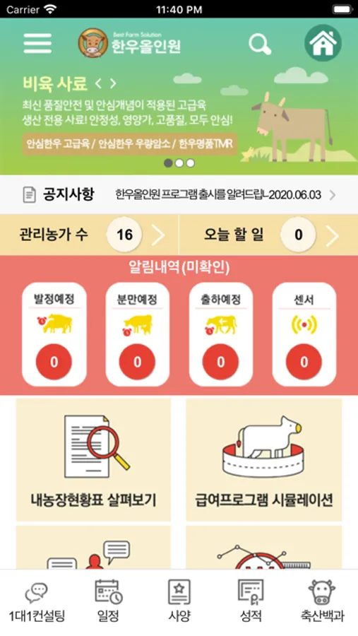 농장별, 개체별, 우군별 구분 관리 및 번식우의 발정, 임신감정, 출산 예정일 관리가 앱 및 웹페이지로 관리 가능하며 push 알람 설정을 통해 농장의 주요 스케줄을 받아볼 수 있습니다. 예를 들어 발정 후 재발정 시기에 알람이 울리고, 임신감정 후 임신으로 체크해 놓으면 최종 인공수정일로부터 계산하여 출산 예정일 이전에 알림을 받을 수 있습니다. 또한 송아지 출하 예정 시기나 비육우 출하 예정 시기도 설정에 따라 알림을 받을 수 있습니다.