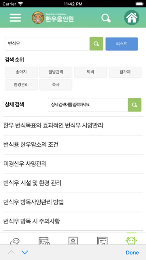 축산백과 및 사양관리 팁 메뉴를 통해 송아지, 비육우 및 번식우의 질병 사양 관리와 각종 축산 법령을 손쉽게 검색하여 정보를 얻을 수 있으며, 다른 사람이 게시한 사양관리 팁을 보고 참고할 수 있습니다.