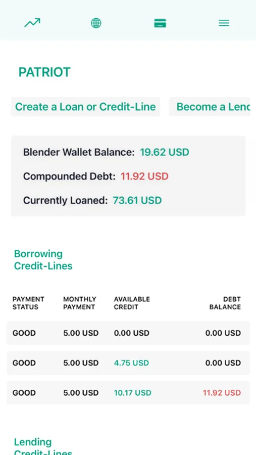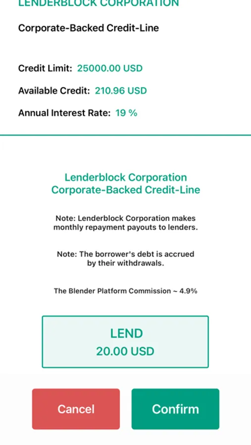 The Blender Platform is a blockchain powered open-end credit platform in which authenticated users can create their own loans (and set their preferred interest rates, and provide minimum contribution requirements of individual potential lenders) using smart contracts on the xDAI Blockchain. Potential lenders may browse through available smart contracts on the platform, assess borrower credibility with quantitative statistics detailing payment frequencies, current debt, current equity etc. Using the provided data, lenders choose which borrowers' smart contracts to lend money.