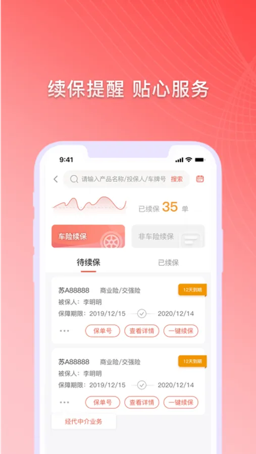 【一键续保】车险一键续保,上年信息无需再录。提前90天续保提醒,还可以记录与客户沟通的重点内容、向客户发送续保提醒短信哦。