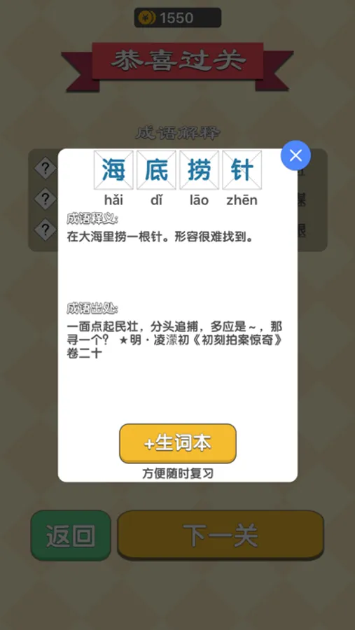 - 生词本功能,随时将不熟悉的成语保存下来,方便复习。