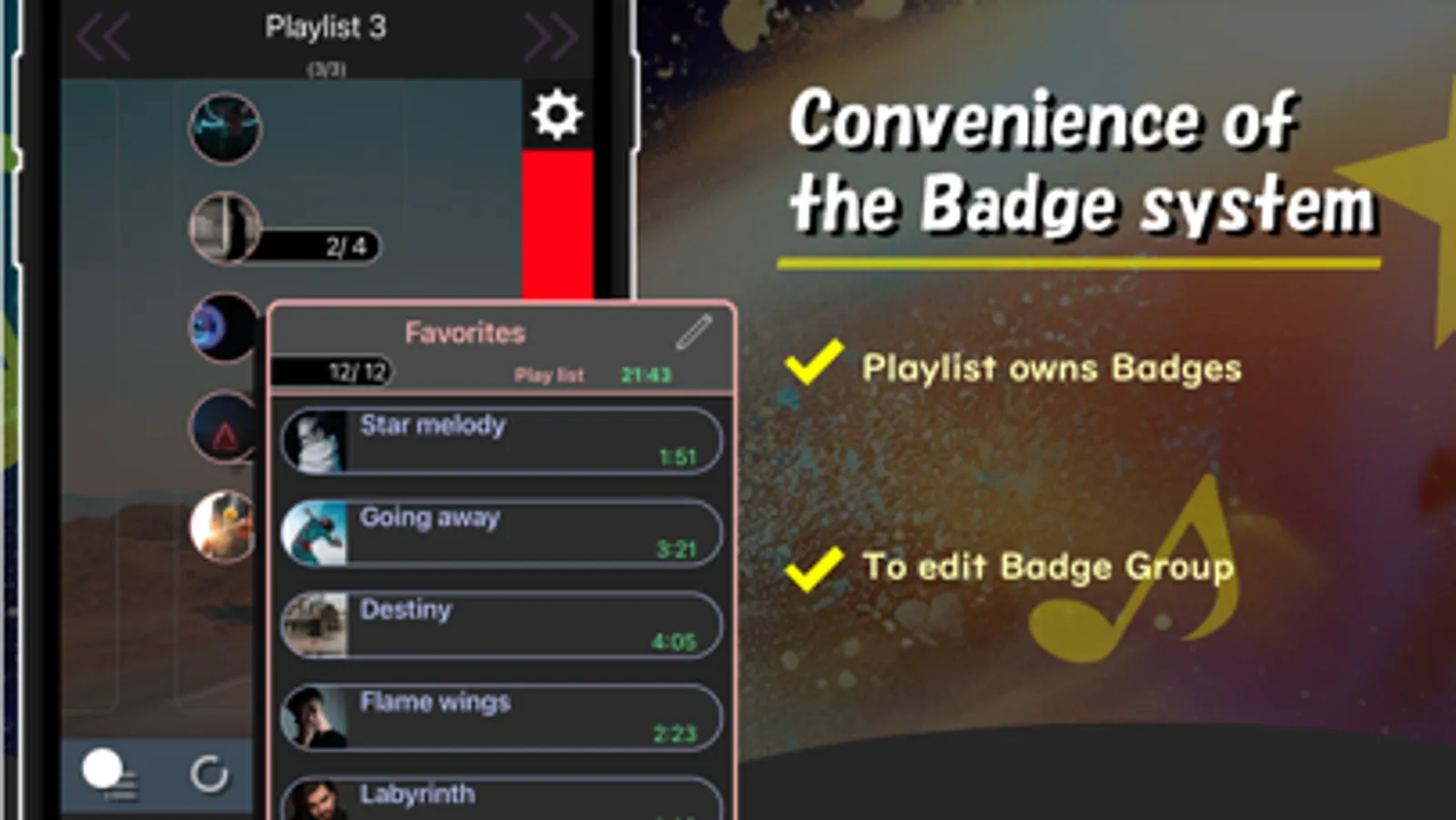 This app uses a system called "Badge system", which allows you to easily manage and operate Songs of Playlist(called Badges) on the app with one tap/drag and drop.