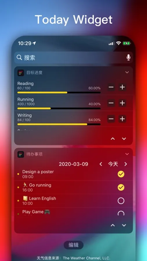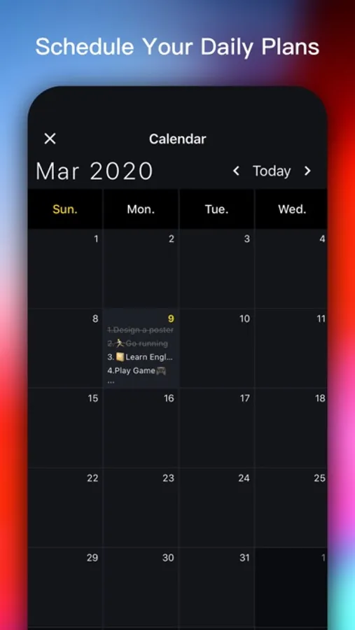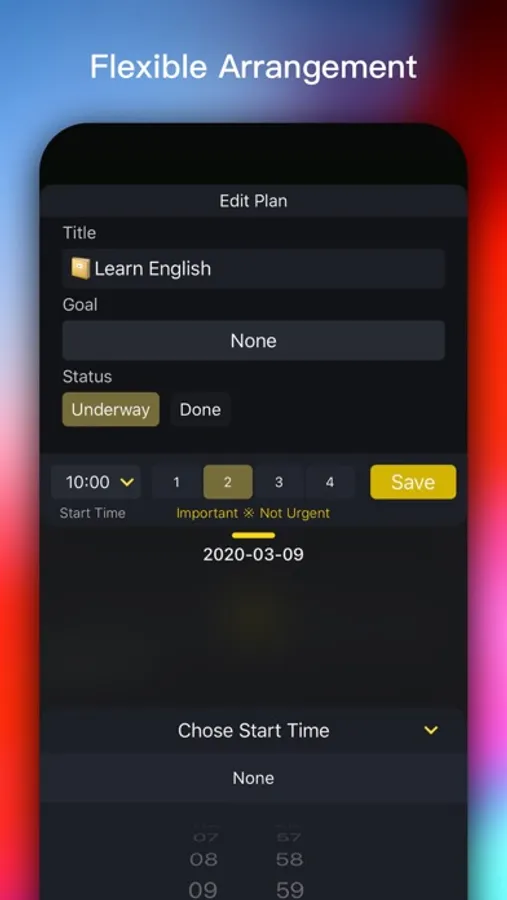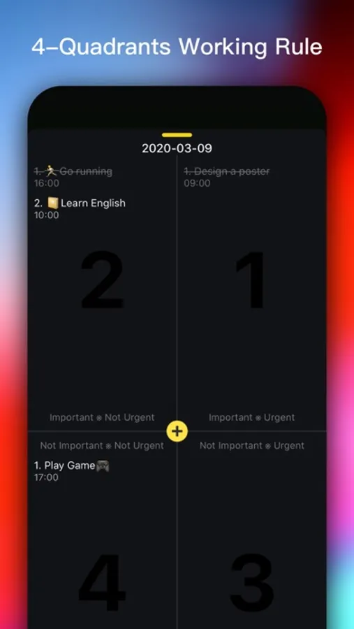 - Working calendar, can set your daily ToDo items or plans, with a four-quadrant model (see below for details) which can be provided for priority management of ToDo items(plans), and can be associated with the progress of the goal. When the task is completed, the goal can be updated
