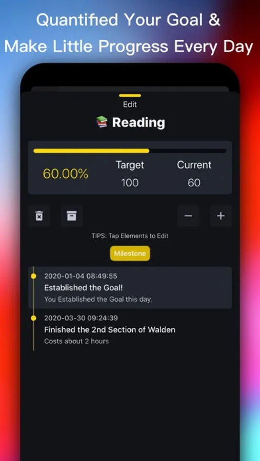 - Create your goals, quantify them in numbers, percentages, and progress bars, and support archiving (recovery) your goals