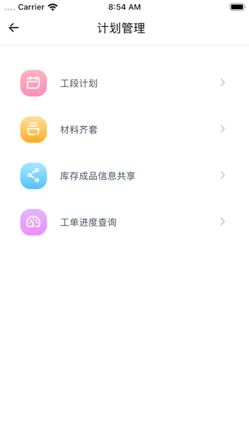 2:计划管理,包括工段计划、库存成品信息共享、工单进度查询;