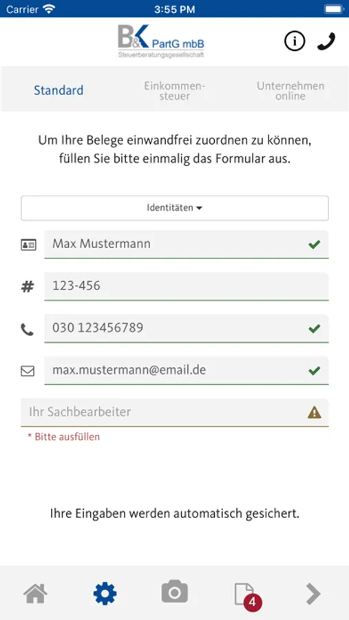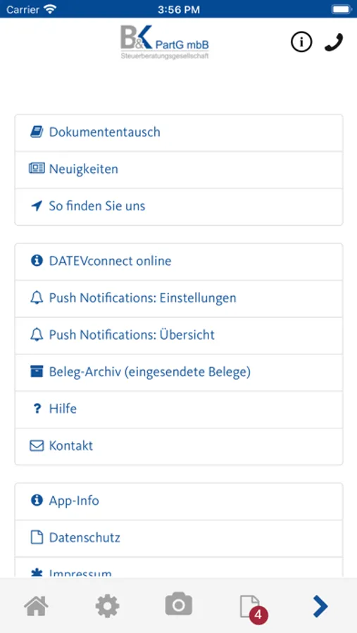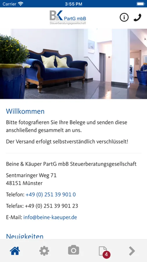 Mithilfe dieser App können Belege, Dokumente und andere Schriftstücke schnell, sicher und komfortabel an Beine & Käuper senden.