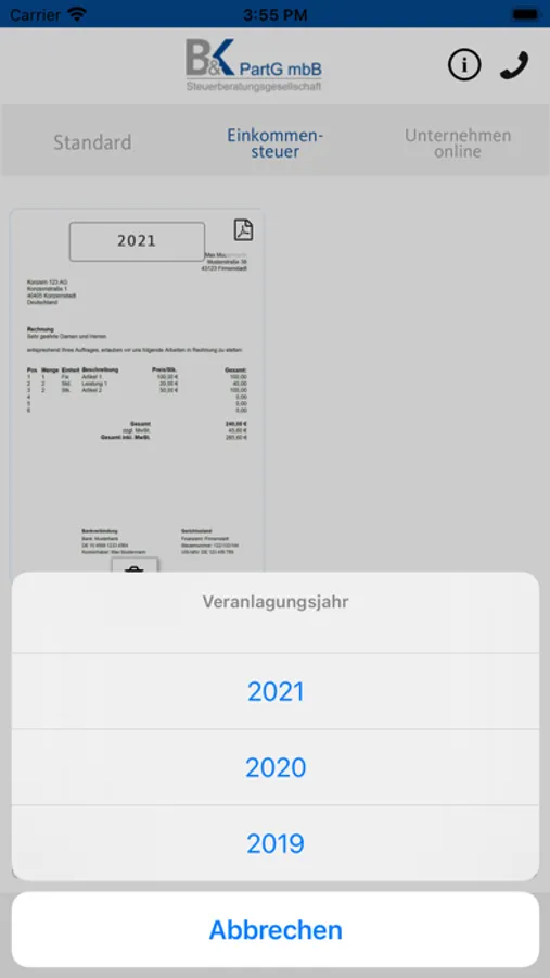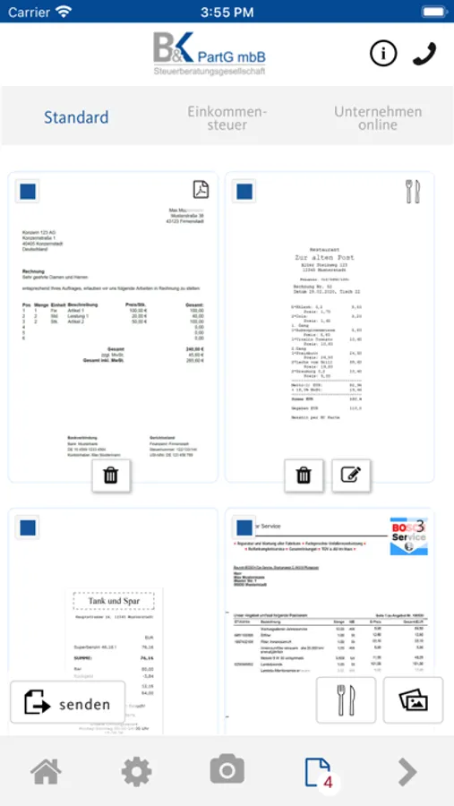 Fotografieren Sie hierzu einen oder mehrere Belege und versenden Sie diese mit einer sicheren Verschlüsselung direkt aus der App heraus an uns!