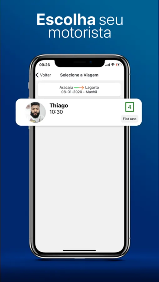 - O app vai utilizar essas informações e apresentará uma lista de motoristas disponíveis. Informações do veículo e foto do motorista serão exibidas imediatamente.