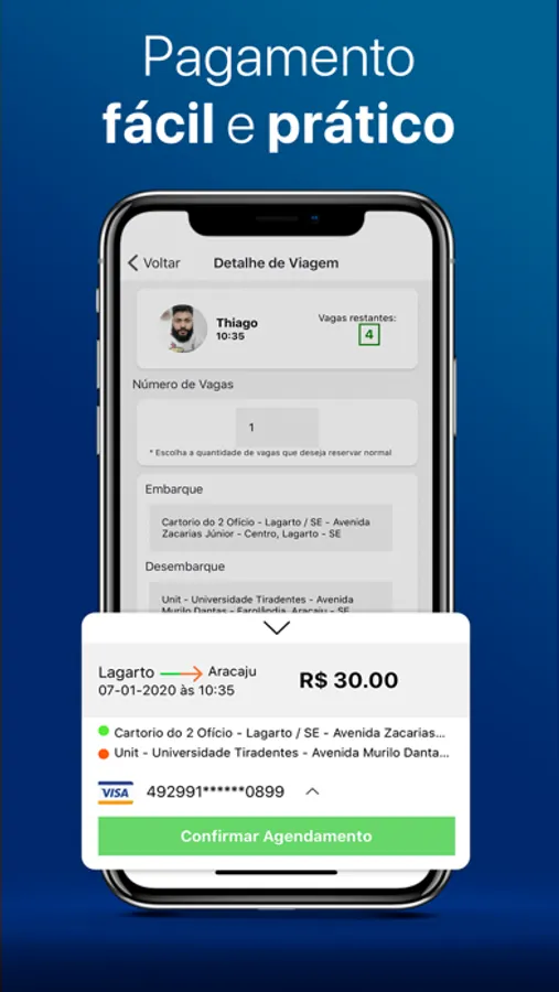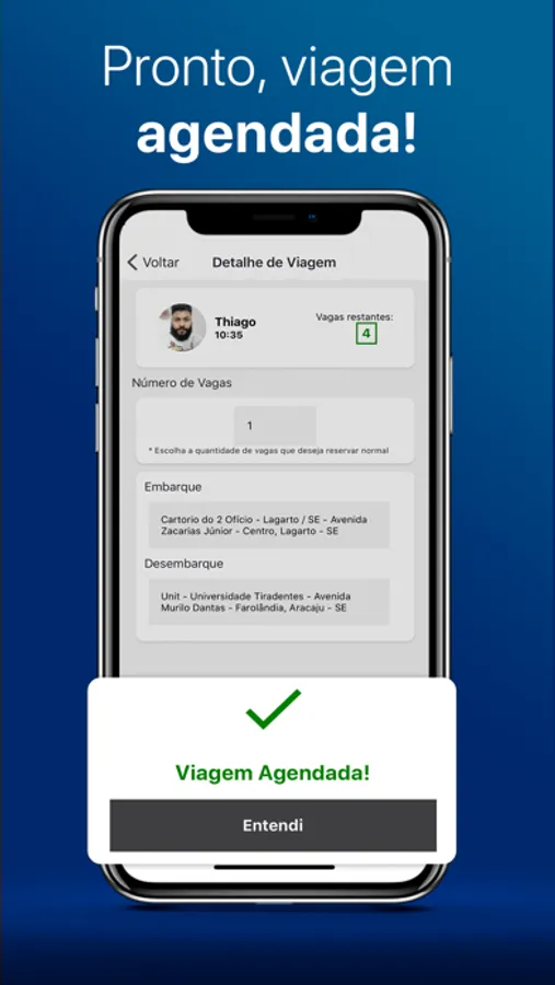 - Clique no motorista desejado. Selecione a quantidade de vagas e digite os locais exatos do seu embarque e desembarque.