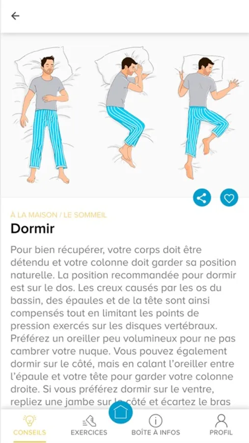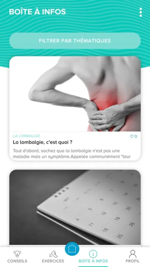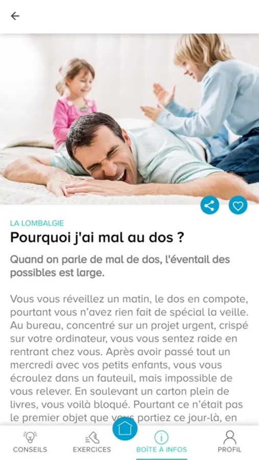 L’application centralise toutes les informations utiles sur la lombalgie et vous offre une motivation et un soutien quotidien grâce :
