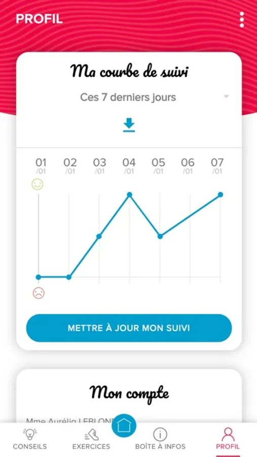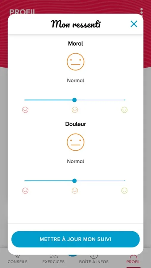 Mon dos & moi prend de vos nouvelles et vous permet de renseigner quotidiennement votre suivi lombalgique. On a en effet souvent tendance à oublier les bons moments et à garder les mauvais ou inversement, bref, à fausser la réalité. Renseigner régulièrement votre état, à la fois physique et mental vous aidera à garder le contrôle, à pouvoir échanger plus efficacement avec votre professionnel de santé, mais surtout à vous faire prendre conscience qu'une évolution est possible !