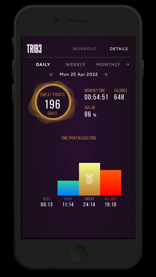 Tracked metrics include calories burned, SWEAT Points earned, heart rate plus your time spent in different heart rate zones and you can toggle between daily, weekly and monthly views as well as annual totals.