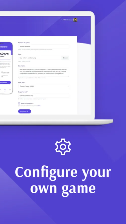 It takes only a few clicks on this website to create your own game. You can personalize it by naming the event and optionally by defining a game description with a logo. Once you finish the setup, you will get an invitation code, which players will use to access the game.
