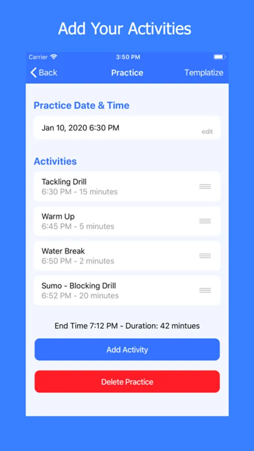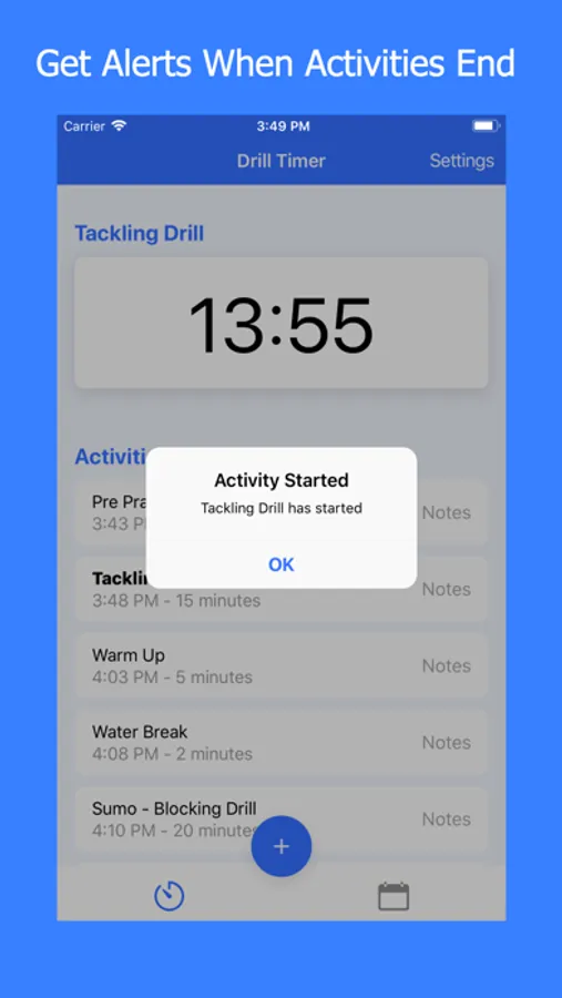 This app is used by coaches to get alerts when a Practice Drill Ends. Instead of using your phones default alarm, timer, or stopwatch (which are hard to update when practice times change), use the Coaching Drill Timer app.