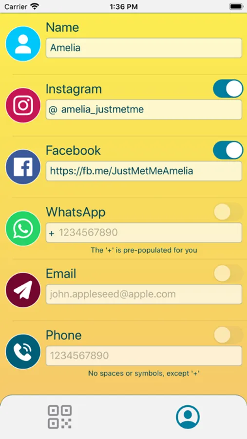 Before sharing, you can turn your different contact details on or off depending on which ones are relevant with the particular person you meet.