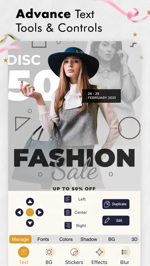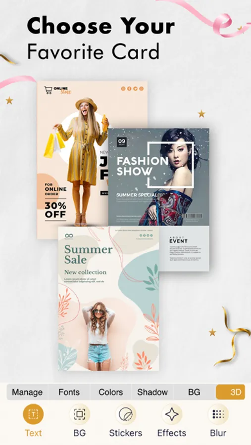 The Create from Scratch feature allows you to create invites from black. You can select your desired background; the app offers 10+ background theme categories. You can add text and customize its font, color, size, and background. You can also adjust the shadow, transparency and dimensions (using the 3D feature).