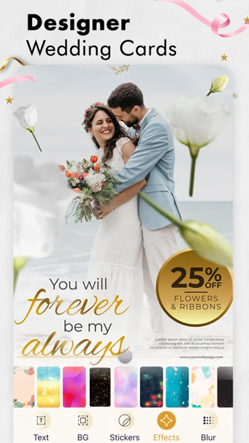 The app allows you to add filter effects to your invitation cards. It comes with 30+ filter effects to choose from. You can also choose to blur the background with the Blur option.