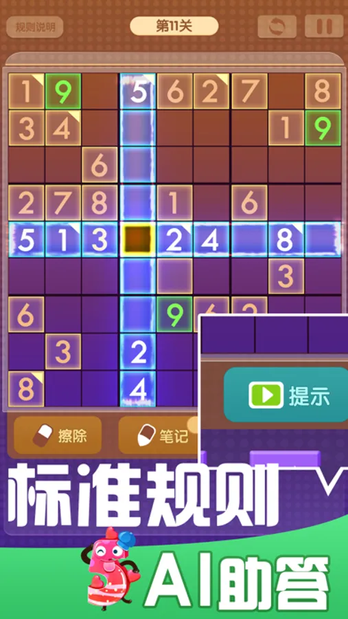 【辅助答题】-擦除错误答案,记录未知推理,单步求解提示,协助解谜而不失乐趣;关卡设计由简入难、循序渐进,让新手也能快速享受数独魅力。