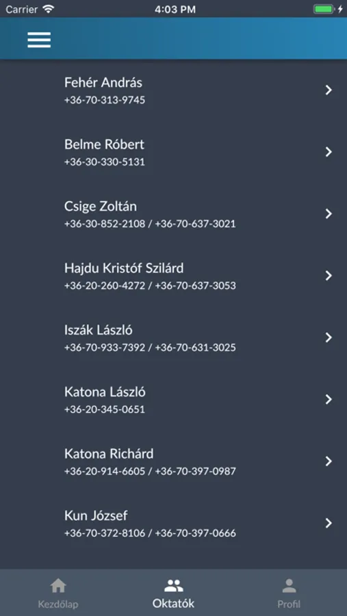 -applikáció profil oldal