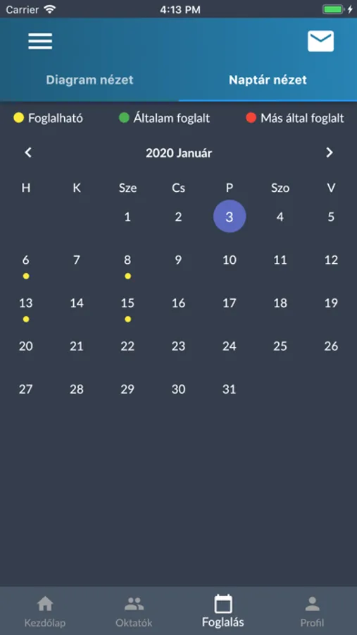 bejelentkezés után a tanuló látja az oktatójának a foglalható időpontjait. Foglalhat vezetési időpontot, amiről megerősítő emailt kap.