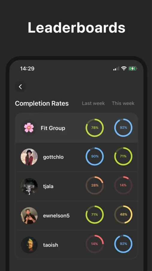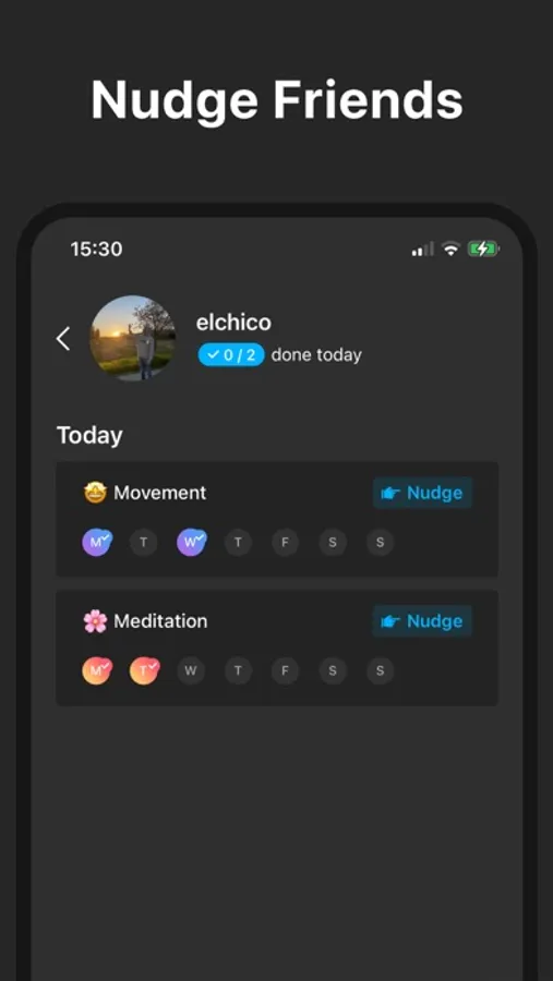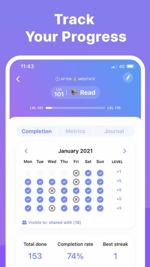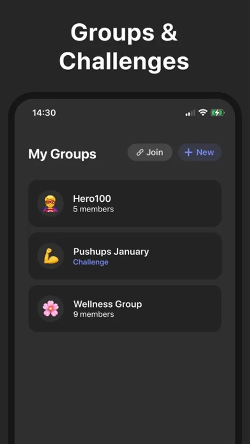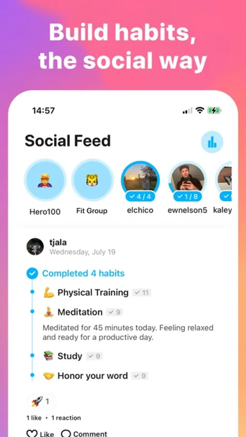 You can plan and track any habit (workout, meditation, journaling, hydration...) and your progress is automatically shared with friends and groups you select