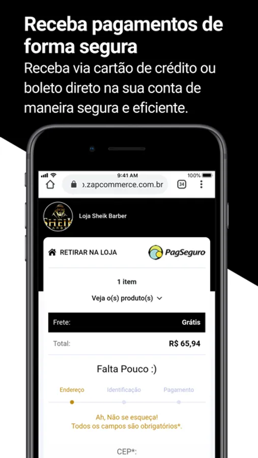 Todos os pedidos realizados via App Sheik Barber já saem direto do estoque da empresa. Você recebe um pagamento de suas vendas, diretamente em sua conta no PagSeguro e não precisa contar apenas com seu estoque pessoal para vender e lucrar mais.