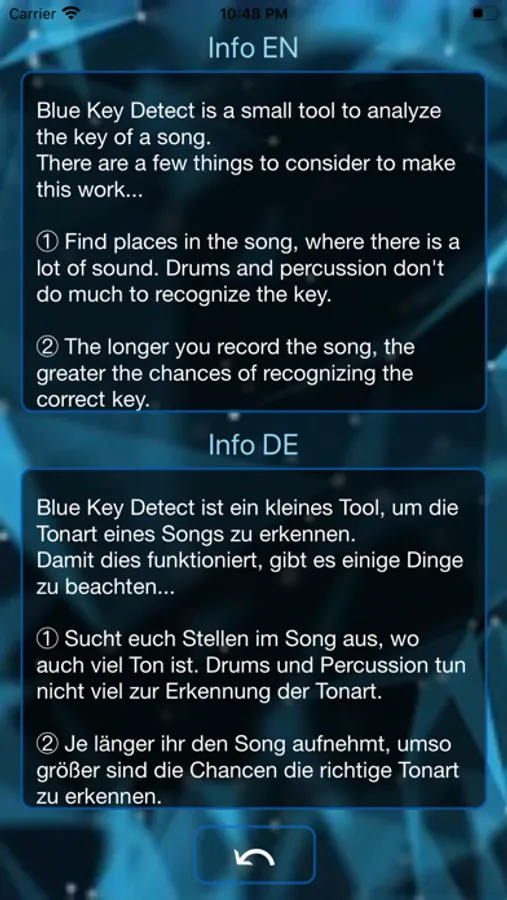 One touch on the display plus a short piece of recording and the beats per minute with the key of the song are displayed. You should record short pieces several times or a slightly longer one to get the correct key displayed.