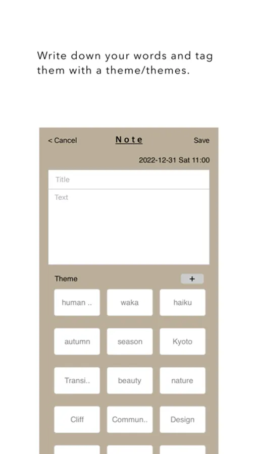 NOTE: Daily journal, morning pages, new ideas....write anything you want, anything you feel. You can tag the note with themes.