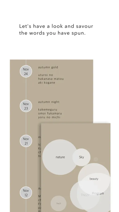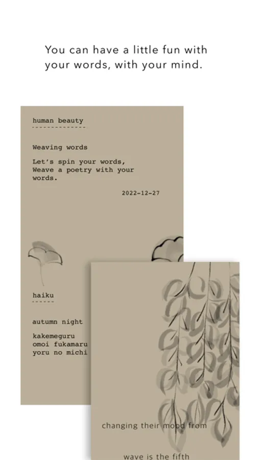 Mind-Haiku: Haiku (俳句) is a Japanese style of poem, which consists of three lines. Because of this simplicity of style, Haiku gives us so much freedom or space for your imagination and inspiration between the words. Mind Flow Sketch creates a Haiku poem with the words you have spun. Enjoy the Haiku by your mind poet.
