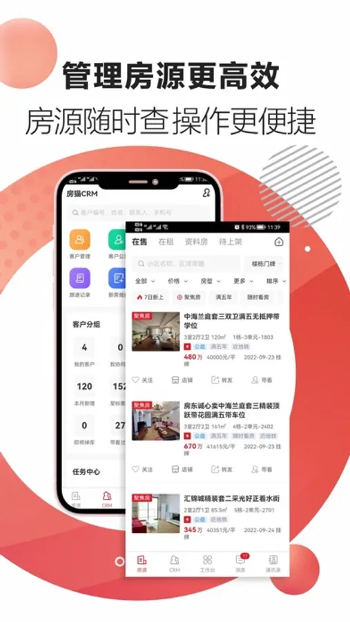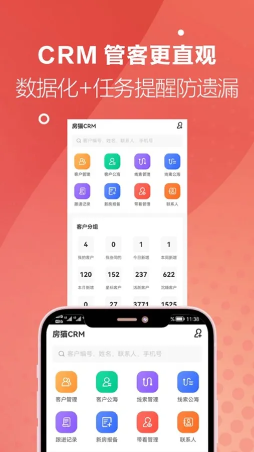 【客源管理】包含客源录入、客户跟进;公客池、商机池分配跟进;待办任务提醒、转移客户、客户数据分析等客户意向更快记录,不会遗漏;