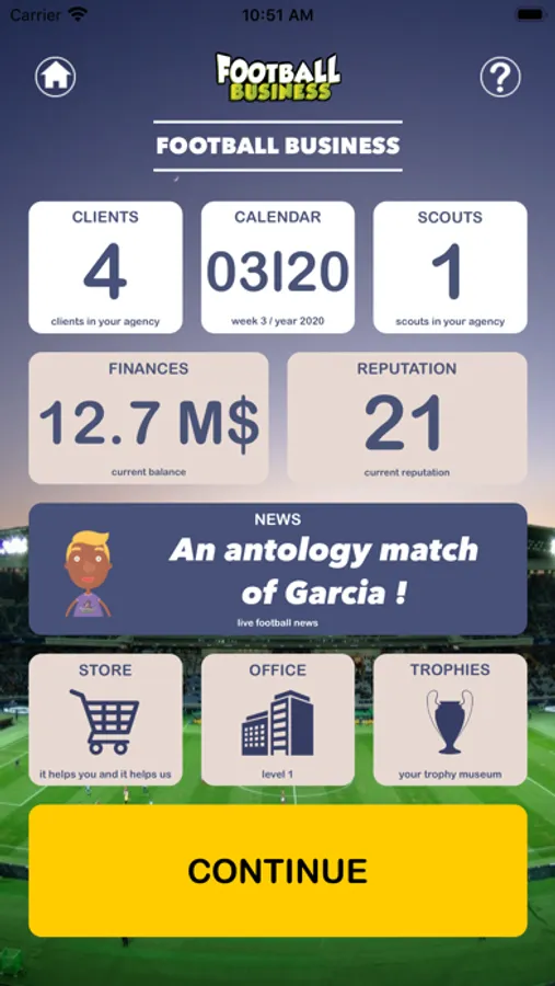 Your ultimate goal: to win the biggest trophies, through your clients, in world soccer: championships of the biggest countries, European club cups, world championship.