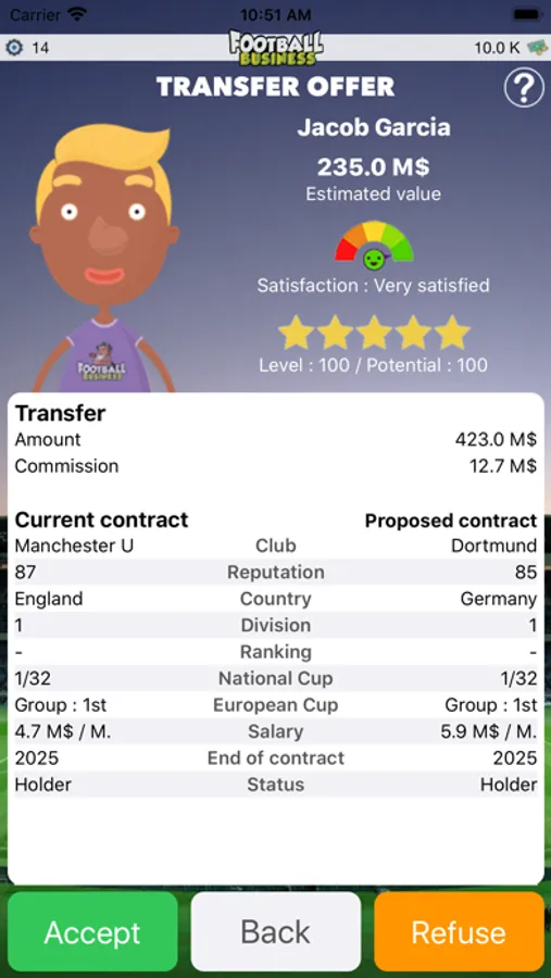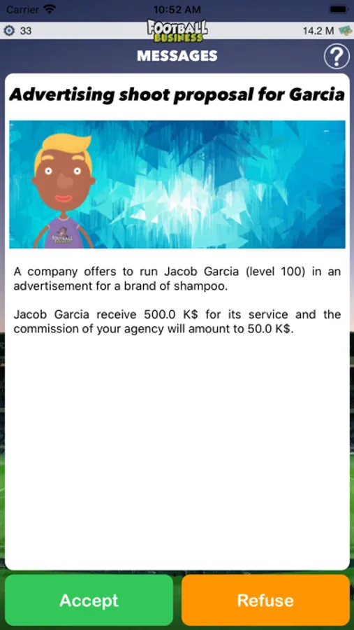 Your main mission is to advise your clients in their choice of clubs and contracts. When a transfer proposal arrives at your office, you will have to take into account multiple parameters to finally answer a simple question: does your client have to sign this contract?