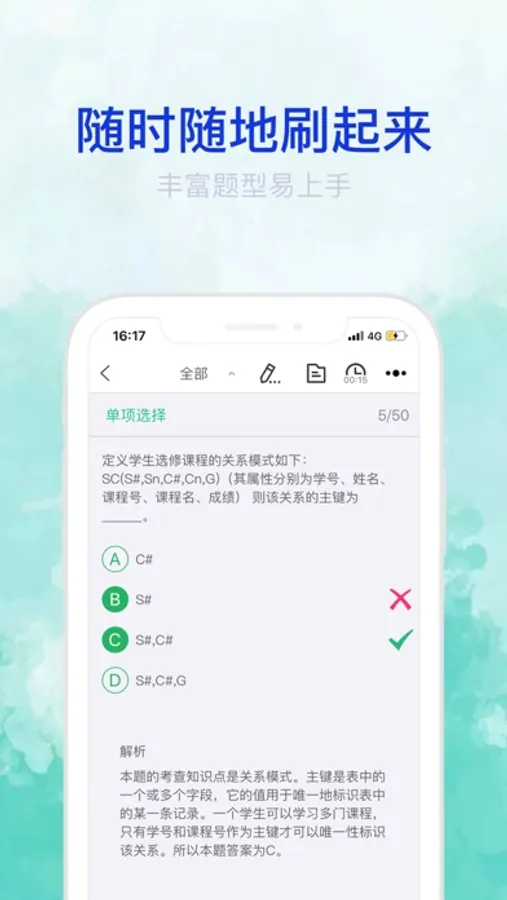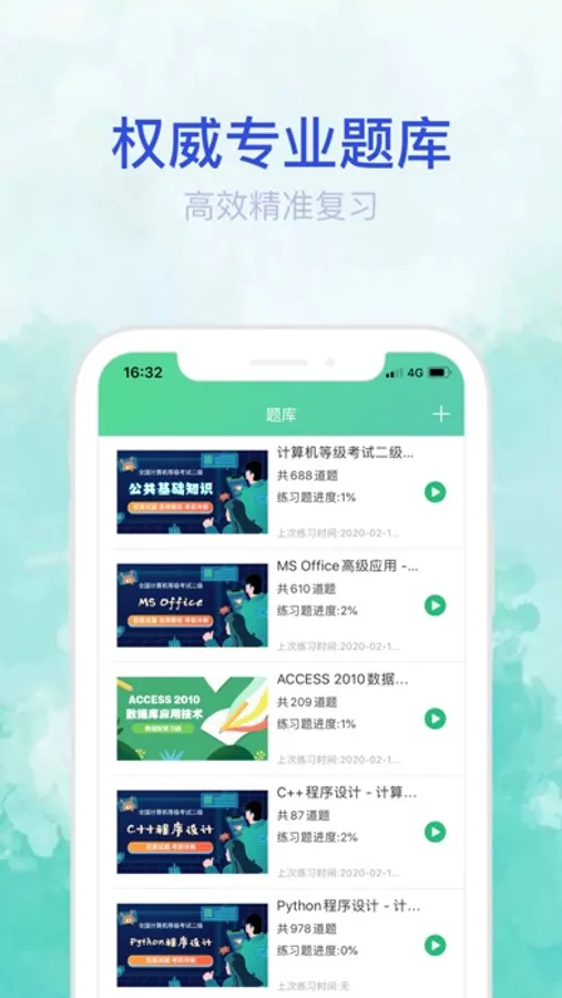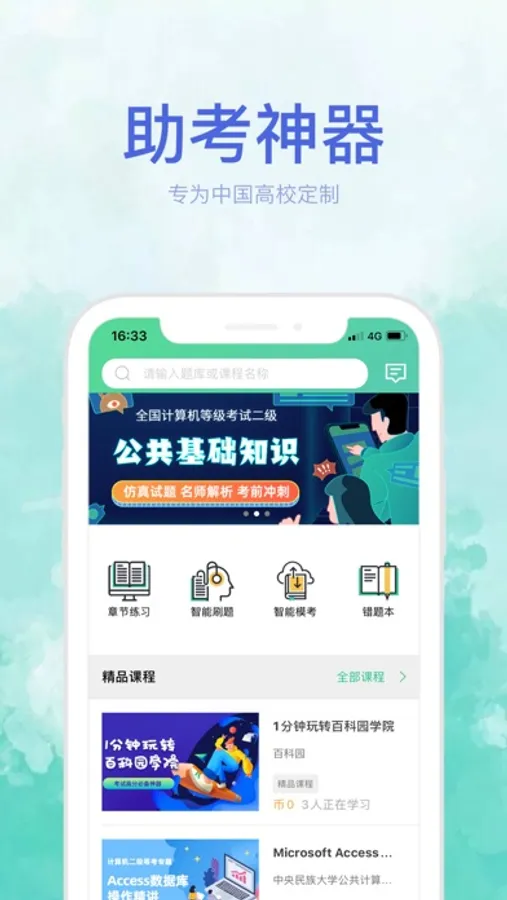 提供适用于各大高校的计算机等级考试、公共英语过级、思想政治基础课程,以及计算机、物理、数学、化学、医学、药学、语言学(英语/日语/韩语/蒙古语/俄语等)、金融、经济、政治等多项专业课程、相关资格证书快速检测通关的在线日常练习、考前刷题及模拟考试训练,并提供来自于专业教师的习题讲解、重点难点解析、考前辅导、过考精讲等精品视频。