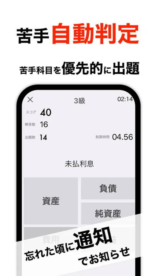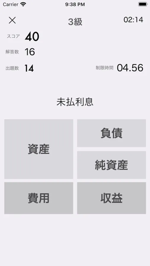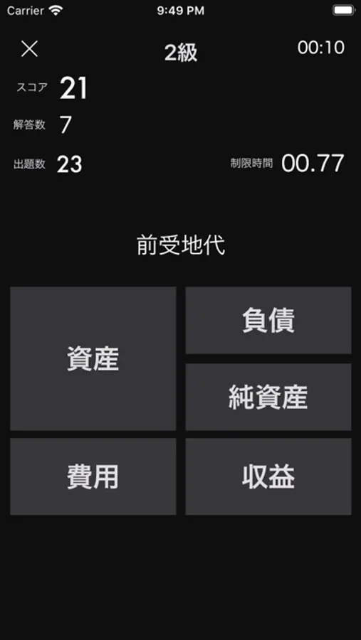 出題される勘定科目のホームポジションを「資産、負債、純資産、収益、費用」のいずれかタップします。