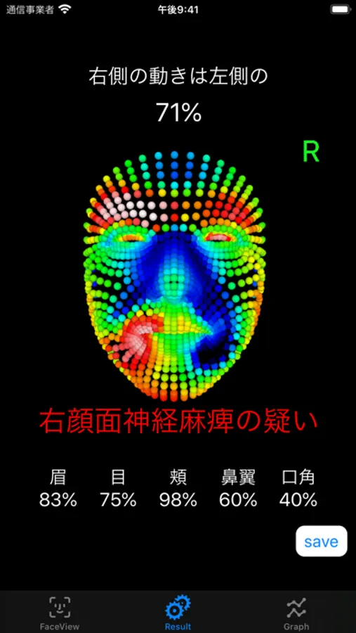 フロントカメラユニットを使用して顔の表情の左右の動きの差を表示します。