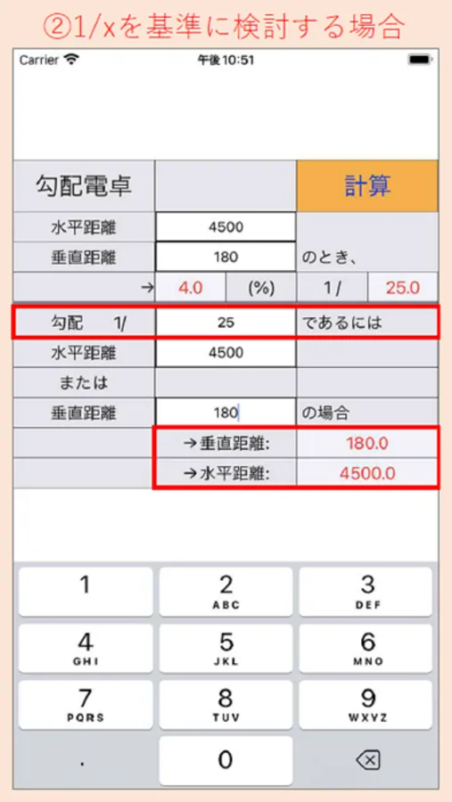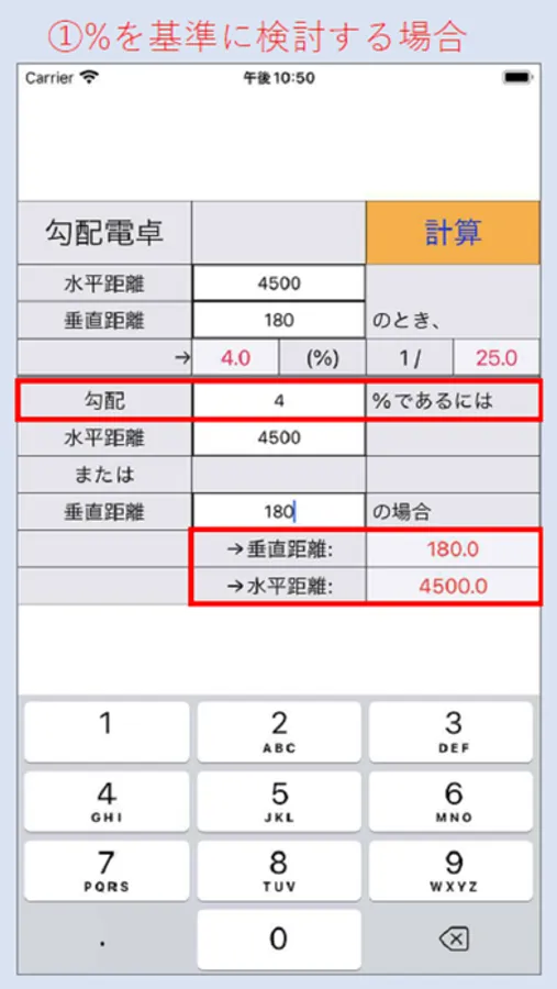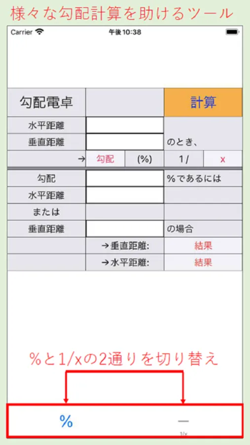 Calculate instantly by inputting horizontal distance, vertical distance or gradient as a condition.