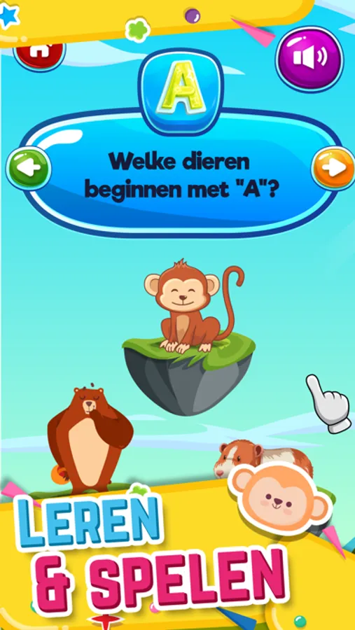 Deze module leert peuters om de letters correct te herkennen door deze te associëren met een dier. Bijvoorbeeld "welk dier begint met M" en het antwoord zou "aap" zijn. Elke keer als ze correct beantwoorden, moedigt een klappende geluid uw kleine ABC-genie aan en motiveert het!