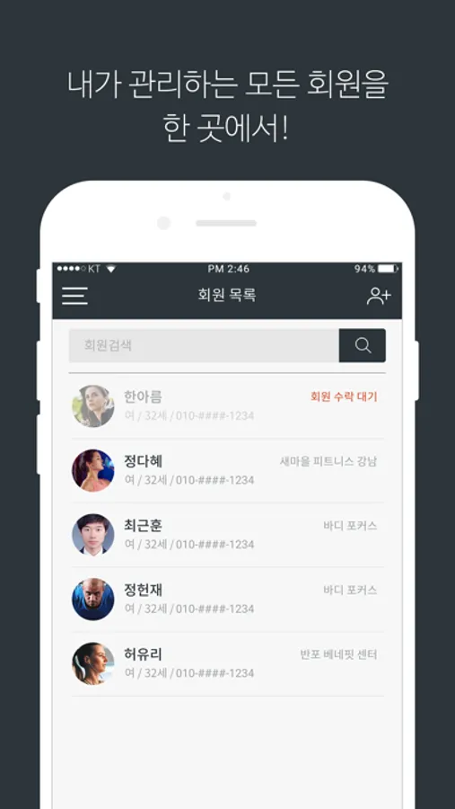 회원들에게 홈 트레이닝 및 PT에 대한 과학적인 운동 제공, 그리고 지금 차트와 머리속으로만 하던 회원 관리 방식을 늘 나와 함께하는 스마트폰을 이용해 간단하게, 잊어버리지 않도록 활용해 보세요.