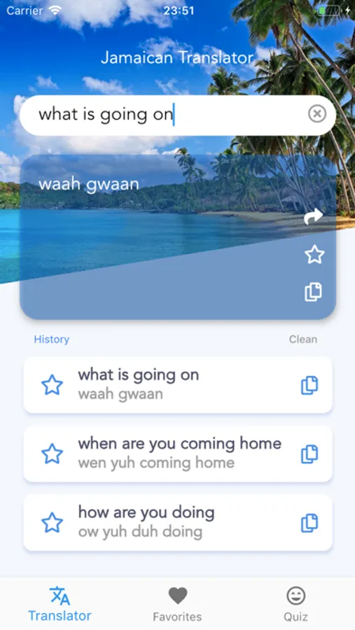 Translate and send your translations with your favorite Instant Messaging app to friends, families or even Jamaican natives. Learn more about patois by doing quizzes