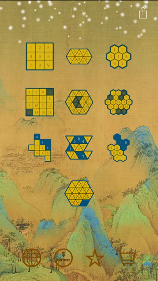 This APP extended the classic 15-Puzzle to triangle and hexagon. Added fixed blocks and irregular board mode. There are Three modes, THREE shapes. Each have SIX difficulty.